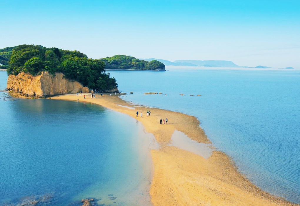 天使の散歩道「エンジェルロード」は小豆島でも有名な人気の観光スポット。1日2回引き潮時にのみ、海の上に現れる白い砂の道は幻想的です。別名 恋人の聖地 とも呼ばれ、弁天島と中余島を繋ぐ道を、手をつないで渡った2人は幸せになれるという言い伝えがあり、季節問わず多くの恋人や観光客が訪れます。